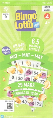 Sponsorvinjett spelas upp. Daniel välkomnar tillbaka. Daniel påminner att man kan ringa in på Jackpotten med räknesnurra. Daniel snackar med This is the moment – en historisk musikalresa i tiden som startar åt Daniel ' tvåans bingo. Husbandet spelar musik och bilder från studion, tittare och vinstplanen visas. Daniel tackar husbandet och uppmanar tittare som fått bingo att ringa in. Daniel uppmanar tittarna att ringa in på Stora lotten. Daniel snackar med This is the moment – en historisk musikalresa i tiden. I bild påminner man att ringa in på Stora lotten. Daniel påminner att man kan ringa in på Stora lotten. Daniel pratar med telefonörer, första har dubbellott och väljer Ångermanland. I bild påminner man att ringa in på Stora lotten. Andra väljer Uppland. Daniel kör Jackpotten med spelaren som har dubbellott. Daniel startar Lyckohjulen. Videoklipp vad man kan vinna på Lyckohjulen spelas upp. Daniel berättar hur man spelar Lyckohjulen. Daniel presenterar dagens nummer i Lyckohjulen. Husbandet spelar musik och bilder från studion, tidigare program och vinstplanen visas. Daniel snackar med Finalspelarna. Daniel påminner att man kan ringa in på Stora lotten. Daniel berättar vad som händer efter pausen. Sponsorvinjett spelas upp.