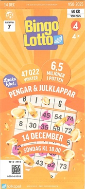 Sponsorvinjett spelas upp. Husbandet uppträder. Lotta berättar vad som händer och kommande dagar. Lotta snackar med Filippa. Lotta påminner att man kan ringa in på Bankvalvet. Lotta snackar med Rickard och Filippa. Lotta startar treans bingo. Lotta snackar med Thomas Hellsten från husbandet. Husbandet spelar musik och bilder från studion, tittare och vinstplanen visas. Lotta uppmanar tittare som fått bingo att ringa in på. Lotta uppmanar tittare som inte fått bingo att ringa in på Slutspelet som hon avslöjar är 50.000 kr. Ylva & Linda och Rickard Söderberg uppträder. I bild påminner man att ringa in på Slutspelet om man inte fick bingo. Lotta lottar ut Finalspelet på ett serie och lottnummer. Lotta påminner att man inte kan ringa in på Slutspelet om man inte fick bingo. Lotta pratar med telefonörer, första väljer Östergötland. I bild påminner man att ringa in på Slutspelet om man inte fick bingo. Andra har dubbellott och väljer Uppland. Lotta kör Bankvalvet med spelaren. Lotta påminner att man kan ringa in på Slutspelet om man inte fick bingo. Lotta snackar med Filippa och Rickard och ger dem bingolotter, julkulor och saffran. Lotta berättar vad som händer nästa program. Lotta tackar för idag. Husbandet uppträder. Sluttext rullar och vinjetter spelas upp.