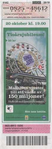 Bilder från Göteborg visas och Lasse välkomnar tillbaka. Lasse pratar med en telefonör som ringt in på 10:årsspelet. Lasse lottar sen ut samma vinst på serie och lottnummer. Lasse uppmanar en av Jubileumshjulsvinnarna att ringa in. Uno Lanka uppträder. Lasse lottar ut Volvo V70 Business på fem serie och lottnummer vara en på dubbelott. Jan Scherman berättar att 950 miljoner lottar har sålts och sitter med Carola, Eddie Olivia och Eivor och Eddie spelar en låt. The Real Group sjunger. Lasse uppmanar igen en av Jubileumshjulvinnaren att ringa in. Lasse skickar iväg hjulvinnarna som ska sätta sig i spelet. Tanterna i publiken snackar med Lasse. Lasse drar en symbol som man får ringa in på att Jubileumshjulet. Lasse berättar att de tar paus.
